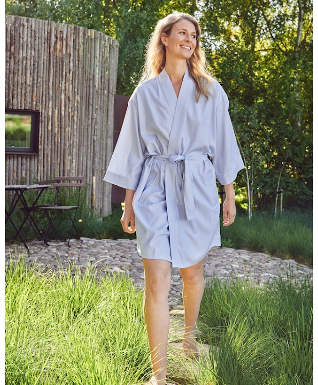 Blød morgenkåbe i et flot blåstribet mønster produceret i bambus. Dette produkt er FSC-certificeret (FSC-C160308) Miljøvenlige fordele ved bambus – bambusplanten vokser op til 1 meter om dagen. Man